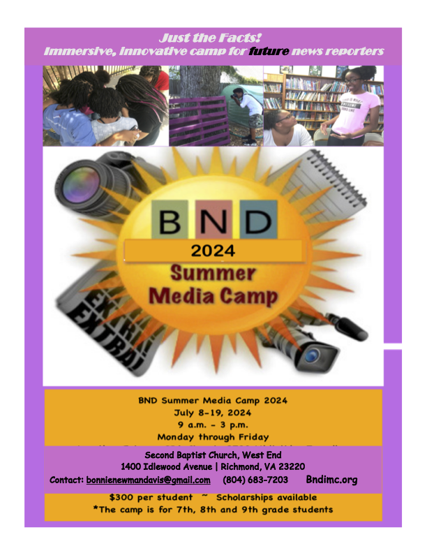 Led by veteran journalist and college educator Bonnie Newman Davis, this year’s camp will take place July 8-19, 2024. The location is Second Baptist Church, West End, 1400 Idlewood Ave., Richmond, Va. 23220.