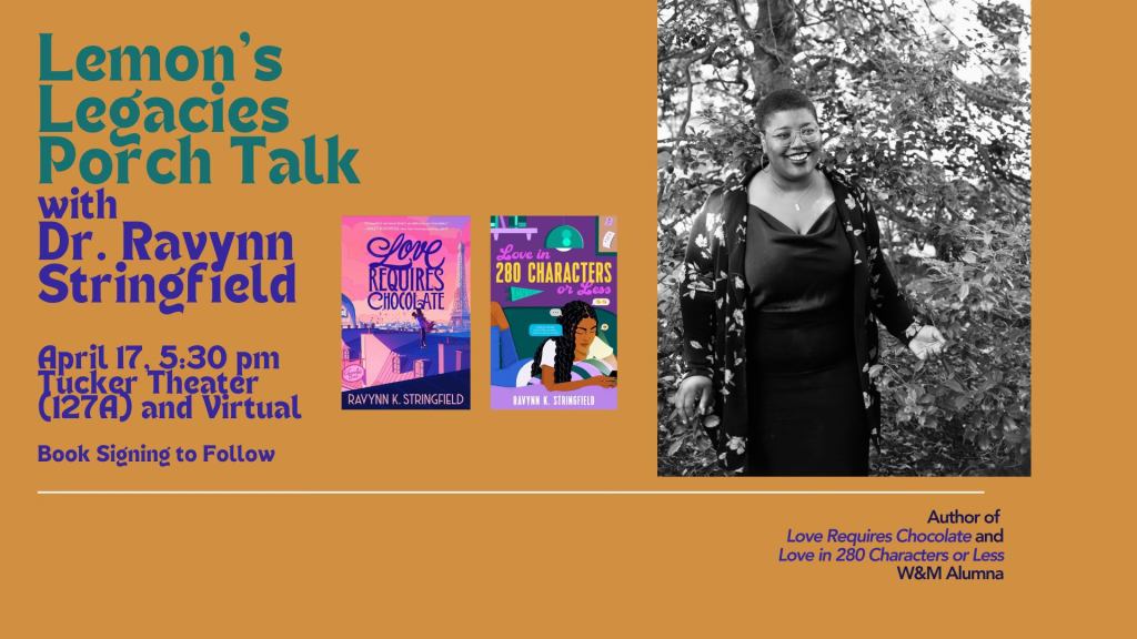 Join the Lemon Project on Thursday, April 17 at 5:30 pm ET for the next Lemon’s Legacies Porch Talk as author and W&M alum Dr. Ravynn Stringfield joins us to celebrate the launch of her new book, Love in 280 Characters or Less. Ravynn will read a selection from her work and then take part in a conversation. After the Porch Talk, come to Tucker Lobby to purchase Ravynn’s books. Ravynn will also be signing books in the foyer. Read more about Ravynn and register at https://events.wm.edu/event/view/lemonproject/363093 Dr. Ravynn K. Stringfield is an author, editor and artist based in Virginia. She served as a Lemon Project grad assistant during her time at William & Mary! Ravynn’s debut young adult novel LOVE REQUIRES CHOCOLATE was published by Joy Revolution on August 20, 2024. Her second young adult novel, LOVE IN 280 CHARACTERS OR LESS, from Feiwel & Friends, will release on April 15, 2025. Her book length fiction is represented by Leah Pierre of Ladderbird Agency. #thelemonproject#williamandmary#wmalumi#booktalk