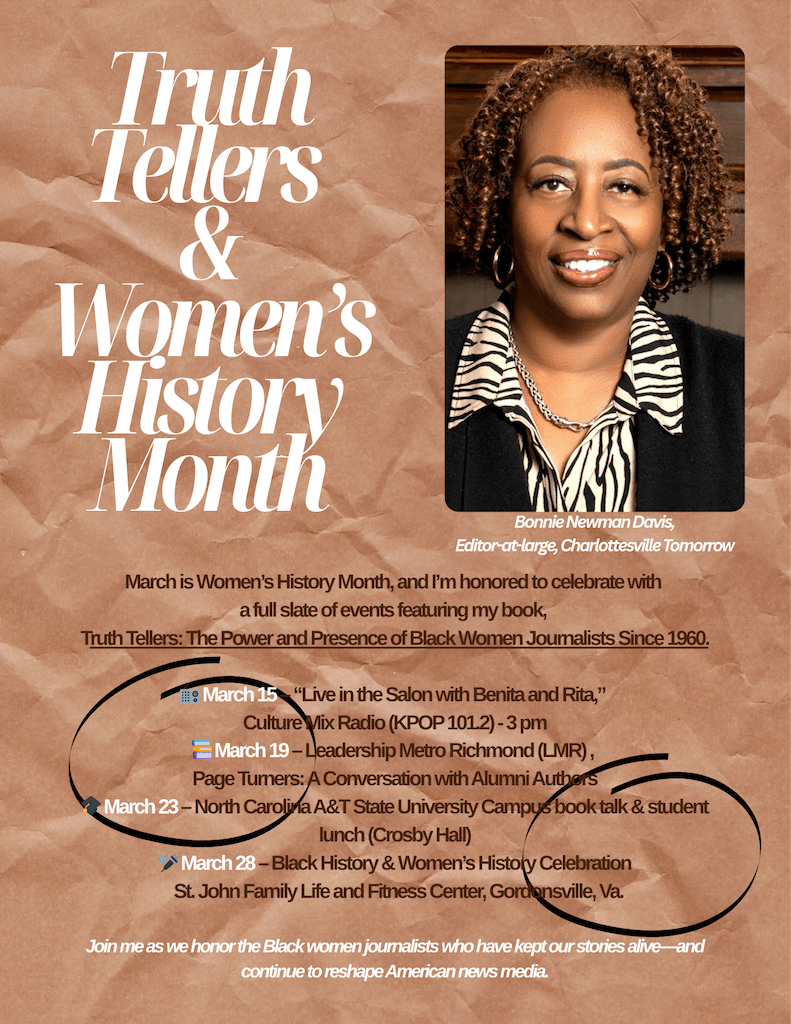 From a live radio conversation on Culture Mix Radio’s “Live in the Salon with Benita and Rita” (March 15) to an exclusive LMR Page Turners alumni author event (March 19), an intimate student book talk and lunch (March 23), and a special Black History & Women’s History Celebration with St. John Family Life and Fitness Center in Gordonsville, Va. (March 28), Bonnie is lifting up the stories of Black women journalists who have reshaped American media.