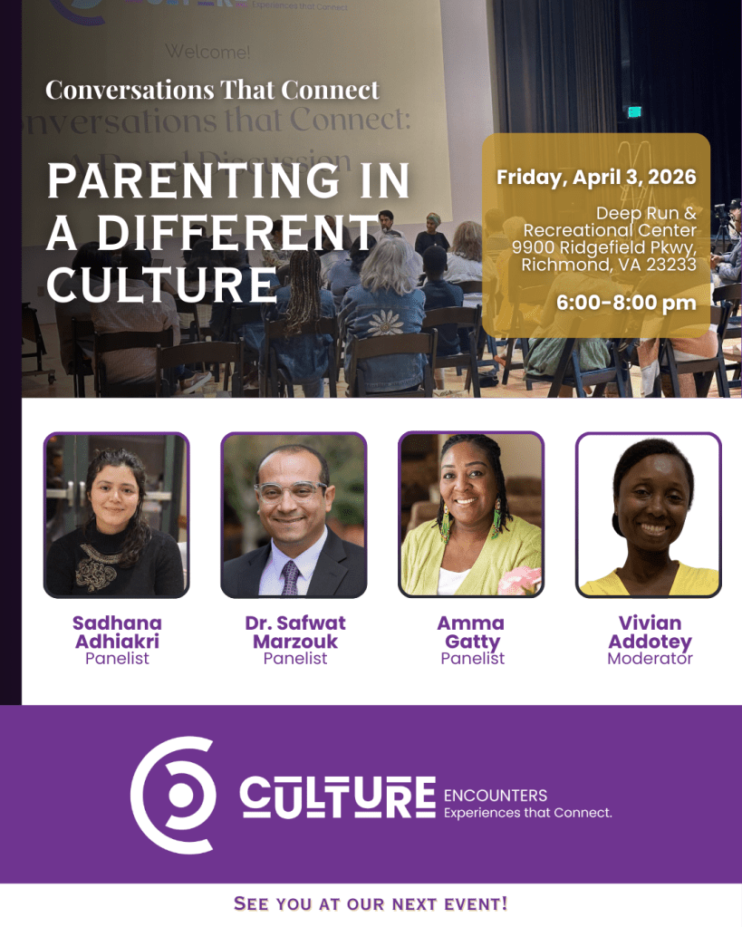 | Conversations That Connect: Parenting in a Different Culture, a meaningful community dialogue will be hosted by Culture Encounters on Friday, April 3, 2026, 6:00–8:00 PM at Deep Run Recreation Center, 9900 Ridgefield Pkwy, Richmond, VA 23233 Parenting is a universal experience, but the way we approach it is deeply influenced by culture. This conversation creates space for sharing stories, perspectives, and challenges of raising children across different cultural environments. Whether you’re a parent, caregiver, educator, or simply curious, this event invites you to listen, learn, and connect through honest and meaningful dialogue. Come listen, share, and connect with others navigating parenting across cultures. Real stories and lived experiences Thoughtful conversations that build understanding A welcoming space for connection and reflection |