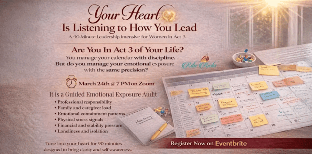 YOUR HEART IS LISTENING TO HOW YOU LEAD is a 90-minute leadership intensive for women 50+ held live on Zoom on March 24 at 7:00 PM. You manage your calendar with discipline, protect deadlines, oversee teams, and handle pressure. But after 50, something else requires the same precision: your emotional exposure. Many accomplished women are strong publicly and overextended privately. They lead organizations, care for aging parents, support children with complex needs, manage demanding bosses, tolerate disrespect, and wake at 3 a.m. thinking. They call it responsibility. The body calls it stress. This is not a basic webinar and it is not a self-care session. It is a structured, category-by-category leadership inventory to help you see clearly what you have normalized. We will move through professional load, caregiver strain, emotional containment, physical signals, financial pressure, and isolation. Each section begins with guided silence. You will write, see, and stop minimizing. Investment: $149. If you are accomplished on paper but carrying more than your nervous system should hold, this room is for you. The solution is in the silence. REGISTER.