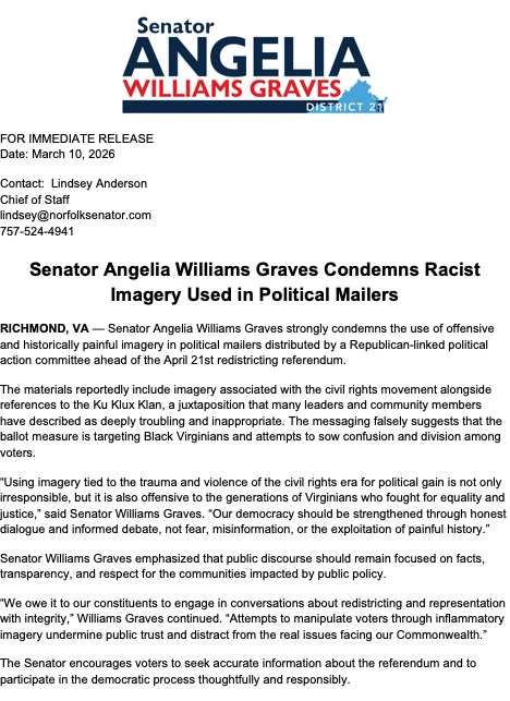 A coalition of progressive organizations says millions of dollars tied to allies of former President Donald Trump are being spent to influence Virginia’s upcoming election, as they denounce what they describe as deceptive mailers targeting Black voters.“The deceptive mailers being sent by the “NO” effort to Black voters across Virginia are offensive, cynical, and deeply disrespectful.These mailers misuse imagery from the civil rights movement and invoke Jim Crow in an attempt to frighten, mislead, and manipulate voters. Exploiting the painful history of racial discrimination in Virginia for political gain is unacceptable.Donald Trump and MAGA Republicans are hellbent on pursuing a national power grab, and are now spending millions of dollars spreading misinformation across Virginia to buy this election. But our communities have fought too long and too hard for the right to vote to allow that history to be twisted and weaponized in this way.Virginia voters deserve honesty and respect — not scare tactics by the “NO” campaigns designed to confuse voters and influence the outcome of this election.We call on those responsible for these mailers to stop these deceptive tactics immediately and allow Virginians to make their decision without misinformation or intimidationWe are voting YES, and we are encouraging Virginians to do the same by April 21 to stop Trump’s power grab and level the playing field.”Virginians deserve the chance to level the playing field — not an election distorted by Donald Trump’s misinformation and MAGA dark money interests.